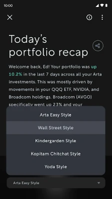 Arta avab uksed tipptasemel investeerimisvõimalustele, mis on tavaliselt kättesaadavad vaid vähestele. Sukeldu läbipaistvasse ülevaatesse erakapitalist, riskikapitalist, eralaenudest, kinnisvarast, kvantstrateegiatest ja riskifondidest. Vali kureeritud fondijuhtide hulgast, nagu KKR, Blue Owl, Carlyle ja Starwood, kes esindavad valdkonna tipptaset. Lisaks toetab sind Arta Copilot – ainulaadne tehisintellekt, mis on loodud spetsiaalselt finantsmaailma jaoks. Loo oma "ühe portfell", mis on kohandatud sinu vajadustele ja riskitaluvusele. Kasuta Arta Copiloti ideede genereerimiseks, turu uurimiseks ja portfelli pidevaks jälgimiseks. Saad kohese finantsanalüüsi tuhandete aktsiate ja ETF-ide kohta, mis aitab sul teha informeeritud otsuseid ja tagab portfelli automaatse tasakaalustamise vastavalt sinu eelistustele.