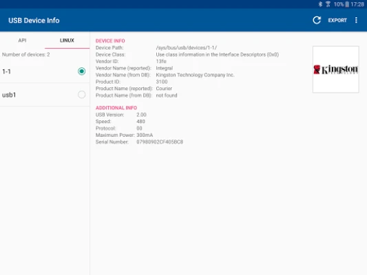 Laiendage oma teadmisi veelgi, täiendades rakendust valikuliste andmebaasidega. Nende abil transformeerub tehniline jada tuttavateks nimedeks: näete seadme tootja nime (mis ei pruugi alati olla brändinimi), tootja logo ja täpset tootenime. USB-Device-Info---Android kasutab kahte nutikat teabe kogumise viisi: Androidi-režiim rakendab süsteemi natiivset USB API-t, samas kui Linuxi-režiim analüüsib sügavuti süsteemifaile (`/sys/bus/usb/devices/`). Mõlemad režiimid pakuvad unikaalseid vaatenurki: Androidi-režiim annab rohkem infot otspunktide ja liideste kohta, Linuxi-režiim aga keskendub seadme enda detailidele, nagu seerianumber ja identifitseerimine.