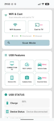 Rakendus pakub enamast kui vaid draiveriabi. Avastage lai valik täiustatud USB-funktsioone, mis optimeerivad Teie seadme ja arvuti vahelist suhtlust. Kontrollige OTG-ühilduvust, et kasutada välisseadmeid, ning uurige kõiki toetatud USB-režiime, nagu MTP, PTP, RNDIS, Audio ja MIDI. Jälgige oma ühenduste ajalugu, kõige sagedamini kasutatavaid režiime ja USB-kasutuse koguaega, isegi seadme temperatuuri aktiivsete ühenduste ajal. Lisaks sellele toetab rakendus USB-kaamerate tuvastust, tagades UVC-ühilduvate veebikaamerate sujuva toimimise. Kuid see pole veel kõik – süvendatud WiFi-analüsaator annab reaalajas teavet Teie võrkude kohta, sealhulgas signaalitugevuse, kanalite ülevaate ja turvalisuse detailid, samuti üksikasjaliku võrguinfo nagu IP-aadressid ja DNS-serverid.